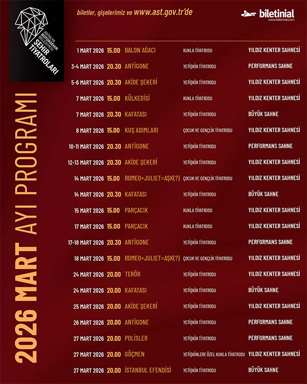 Сердце древнего средиземноморья — город Анталья — трепещет от нетерпеливого ожидания нового месяца. Весна вступает в свои права вместе с театром, дарящим горожанам неповторимые впечатления и вдохновенные моменты творчества. Анталья Городские Театры (АШТ), уже несколько десятилетий несущие высокую миссию культурного наследия, вновь раскрывают двери навстречу искусству и красоте.